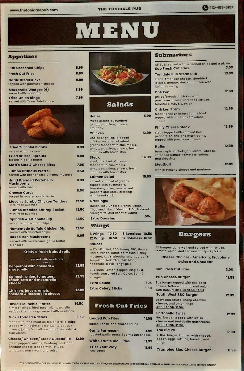 Welcome to The Tonidale Pub, a hidden gem nestled in Oakdale, PA, where the vibrant atmosphere meets culinary excellence. Indulge in a menu that features standout dishes, including the perfectly cooked crumbles blue cheese hamburger, praised for its crispy exterior and juicy, pink center. Customers rave about the fantastic food and generous portions at reasonable prices, making it an ideal spot for gatherings, date nights, or casual nights out.